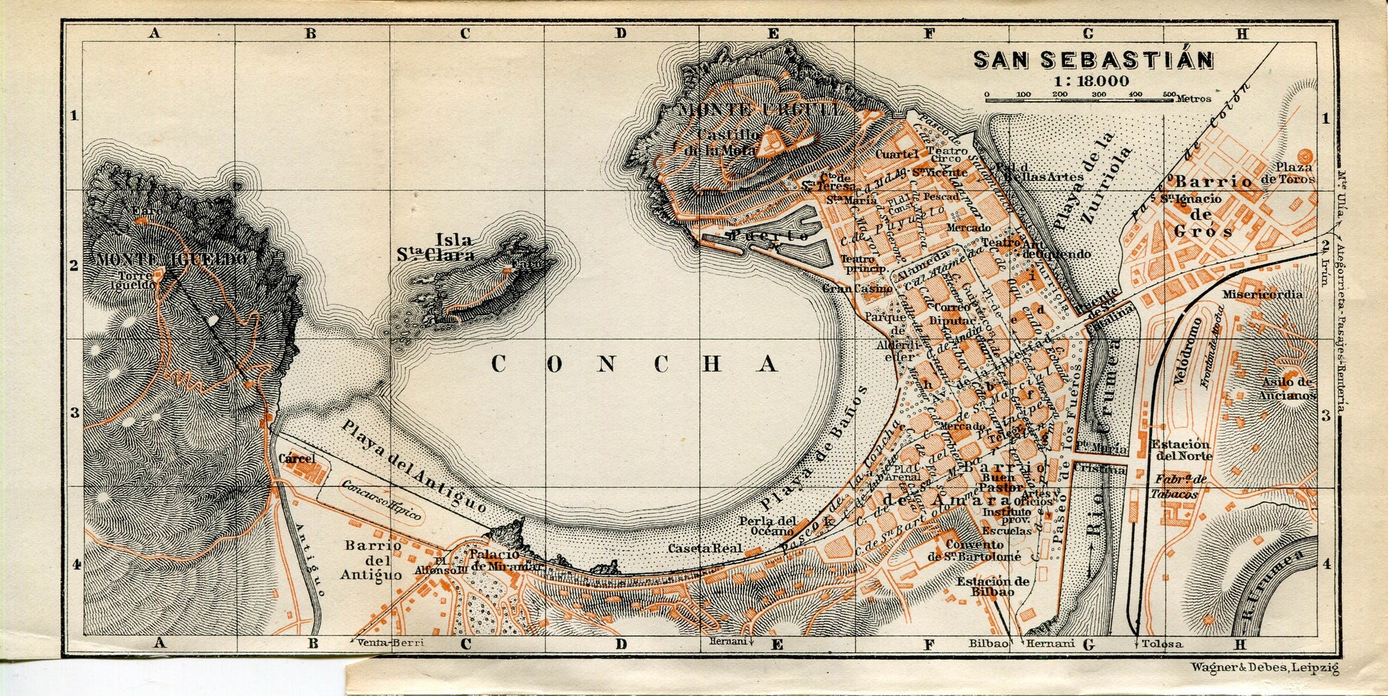 1914 San Sebastian, South of France Town Plan, Antique Baedeker